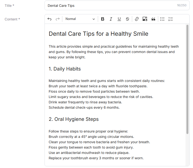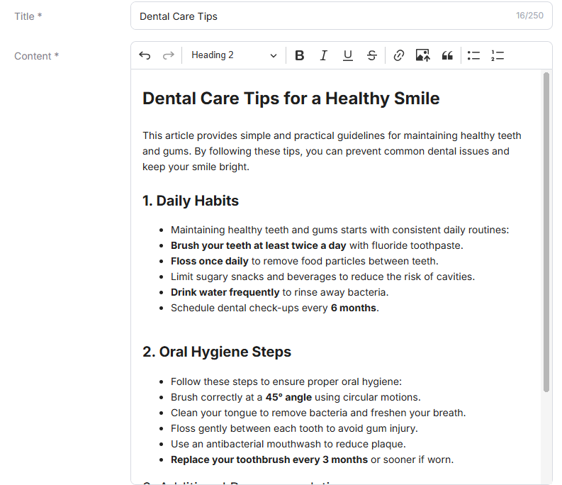 The **Articles** feature allows you to create, manage, and organize detailed written content about your products or services. Unlike FAQs, which are short Q\&A entries, Articles support longer, structured content with multiple sections or headings.