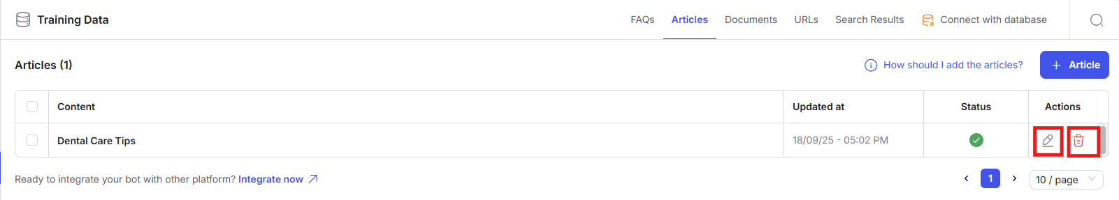 **Delete:** Click the 🗑️ bin icon to remove an article.