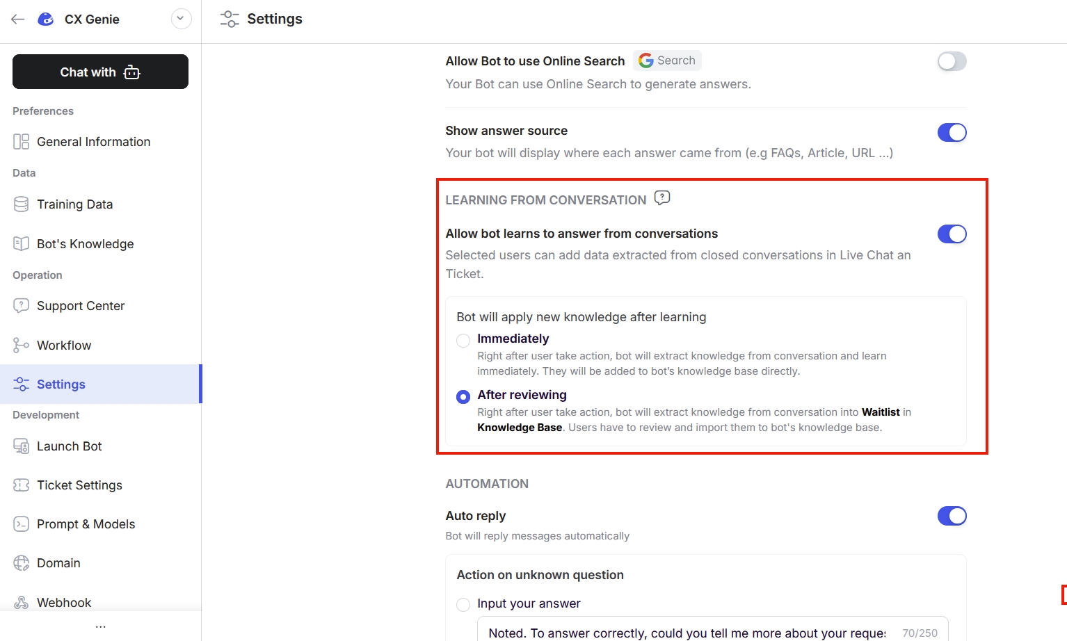 We recommend using Learn After Review to keep your bot’s knowledge base clean, accurate, and trustworthy.
